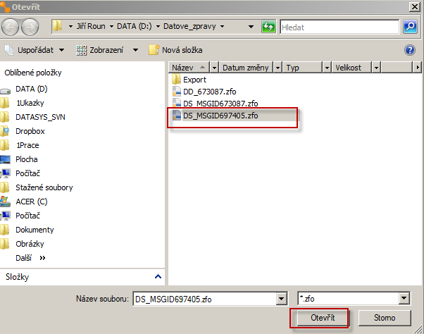 | 3. | Pomocí systémového dialogového okna Otevřít vyhledejte datovou zprávu uloženou do souboru ZFO. Označte tuto zprávu a klepněte na tlačítko Otevřít. |